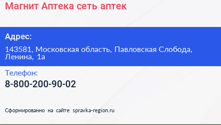 Магнит Аптека, сеть аптек по адресу 143581, Московская область, Павловская Слобода, Ленина, 1а в дальнейшем Организация, размещена в следующих категориях: