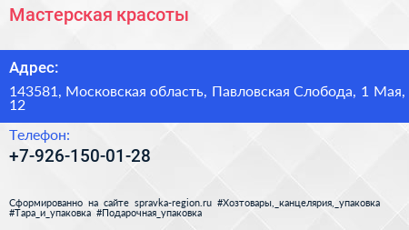 Мастерская красоты по адресу 143581, Московская область, Павловская Слобода, 1 Мая, 12 в дальнейшем Организация, размещена в следующих категориях: