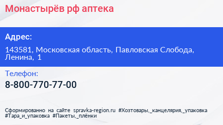 Монастырёв.рф, аптека по адресу 143581, Московская область, Павловская Слобода, Ленина, 1 в дальнейшем Организация, размещена в следующих категориях: