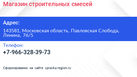 Магазин строительных смесей по адресу 143581, Московская область, Павловская Слобода, Ленина, 76/5 в дальнейшем Организация, размещена в следующих категориях: