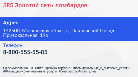 585*Золотой, сеть ломбардов по адресу 142500, Московская область, Павловский Посад, Привокзальная, 19а в дальнейшем Организация, размещена в следующих категориях: