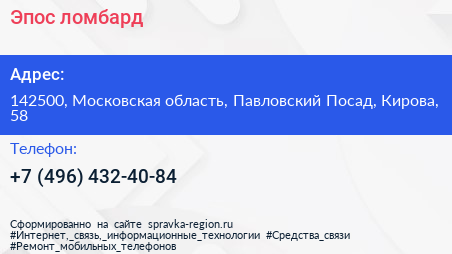 Эпос, ломбард по адресу 142500, Московская область, Павловский Посад, Кирова, 58 в дальнейшем Организация, размещена в следующих категориях: