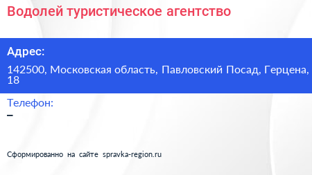 Водолей, туристическое агентство по адресу 142500, Московская область, Павловский Посад, Герцена, 18 в дальнейшем Организация, размещена в следующих категориях: