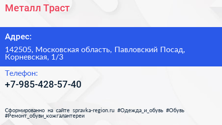 Металл-Траст по адресу 142505, Московская область, Павловский Посад, Корневская, 1/3 в дальнейшем Организация, размещена в следующих категориях: