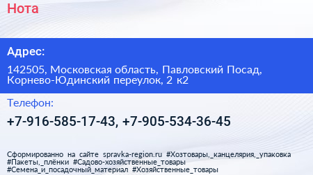 Нота по адресу 142505, Московская область, Павловский Посад, Корнево-Юдинский переулок, 2 к2 в дальнейшем Организация, размещена в следующих категориях:
