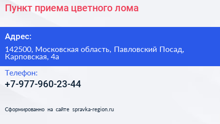 Пункт приема цветного лома по адресу 142500, Московская область, Павловский Посад, Карповская, 4а в дальнейшем Организация, размещена в следующих категориях: