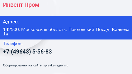 Инвент-Пром по адресу 142500, Московская область, Павловский Посад, Каляева, 1а в дальнейшем Организация, размещена в следующих категориях: