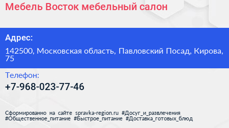 Мебель-Восток, мебельный салон по адресу 142500, Московская область, Павловский Посад, Кирова, 75 в дальнейшем Организация, размещена в следующих категориях: