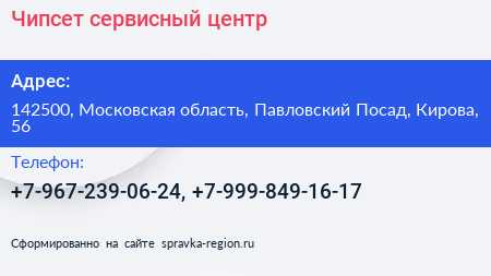 Чипсет, сервисный центр по адресу 142500, Московская область, Павловский Посад, Кирова, 56 в дальнейшем Организация, размещена в следующих категориях: