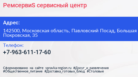 РемсервиS, сервисный центр по адресу 142500, Московская область, Павловский Посад, Большая Покровская, 35 в дальнейшем Организация, размещена в следующих категориях: