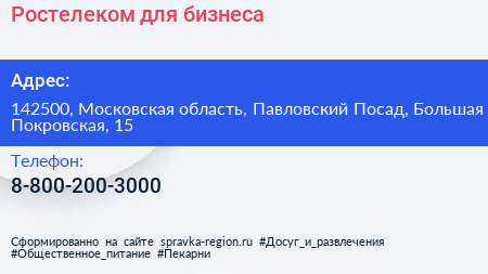 Ростелеком для бизнеса по адресу 142500, Московская область, Павловский Посад, Большая Покровская, 15 в дальнейшем Организация, размещена в следующих категориях: