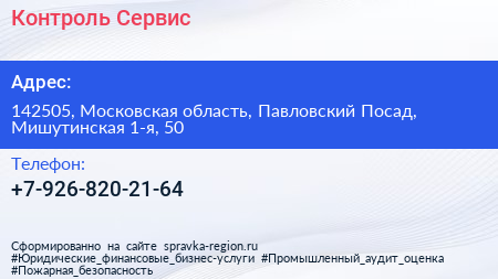 Контроль-Сервис по адресу 142505, Московская область, Павловский Посад, Мишутинская 1-я, 50 в дальнейшем Организация, размещена в следующих категориях: