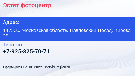 Эстет, фотоцентр по адресу 142500, Московская область, Павловский Посад, Кирова, 56 в дальнейшем Организация, размещена в следующих категориях: