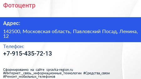 Фотоцентр по адресу 142500, Московская область, Павловский Посад, Ленина, 12 в дальнейшем Организация, размещена в следующих категориях: