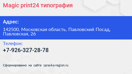 Magic-print24, типография по адресу 142500, Московская область, Павловский Посад, Павловская, 26 в дальнейшем Организация, размещена в следующих категориях: