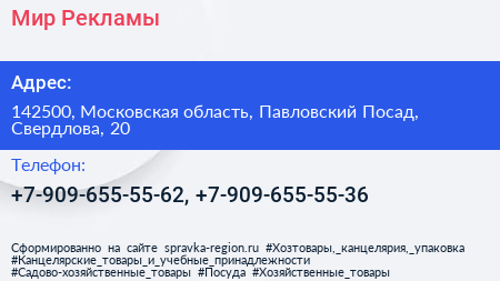 Мир Рекламы по адресу 142500, Московская область, Павловский Посад, Свердлова, 20 в дальнейшем Организация, размещена в следующих категориях: