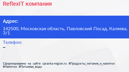 ReflexIT, компания по адресу 142500, Московская область, Павловский Посад, Каляева, 3/1 в дальнейшем Организация, размещена в следующих категориях:
