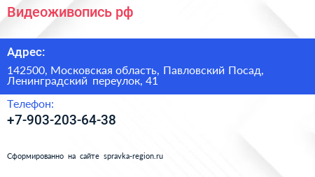 Видеоживопись.рф по адресу 142500, Московская область, Павловский Посад, Ленинградский переулок, 41 в дальнейшем Организация, размещена в следующих категориях: