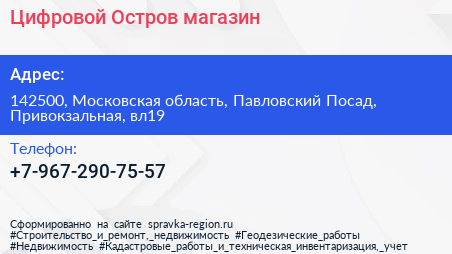 Цифровой Остров, магазин по адресу 142500, Московская область, Павловский Посад, Привокзальная, вл19 в дальнейшем Организация, размещена в следующих категориях: