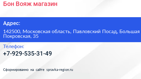 Бон Вояж, магазин по адресу 142500, Московская область, Павловский Посад, Большая Покровская, 35 в дальнейшем Организация, размещена в следующих категориях: