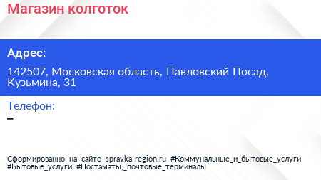 Магазин колготок по адресу 142507, Московская область, Павловский Посад, Кузьмина, 31 в дальнейшем Организация, размещена в следующих категориях: