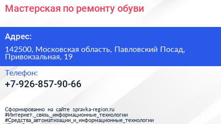 Мастерская по ремонту обуви по адресу 142500, Московская область, Павловский Посад, Привокзальная, 19 в дальнейшем Организация, размещена в следующих категориях: