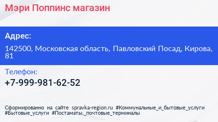 Мэри Поппинс, магазин по адресу 142500, Московская область, Павловский Посад, Кирова, 81 в дальнейшем Организация, размещена в следующих категориях: