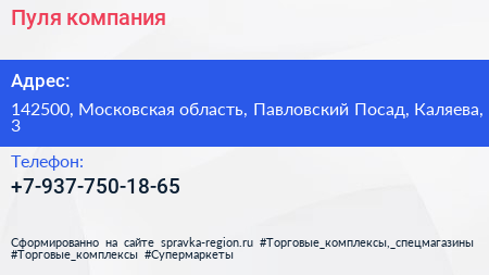 Пуля, компания по адресу 142500, Московская область, Павловский Посад, Каляева, 3 в дальнейшем Организация, размещена в следующих категориях: