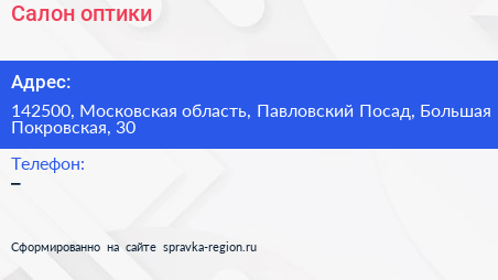 Салон оптики по адресу 142500, Московская область, Павловский Посад, Большая Покровская, 30 в дальнейшем Организация, размещена в следующих категориях: