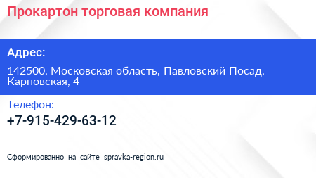 Прокартон, торговая компания по адресу 142500, Московская область, Павловский Посад, Карповская, 4 в дальнейшем Организация, размещена в следующих категориях: