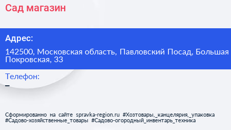 Сад, магазин по адресу 142500, Московская область, Павловский Посад, Большая Покровская, 33 в дальнейшем Организация, размещена в следующих категориях: