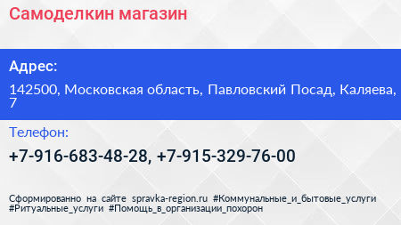 Самоделкин, магазин по адресу 142500, Московская область, Павловский Посад, Каляева, 7 в дальнейшем Организация, размещена в следующих категориях: