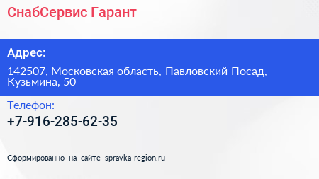 СнабСервис-Гарант по адресу 142507, Московская область, Павловский Посад, Кузьмина, 50 в дальнейшем Организация, размещена в следующих категориях: