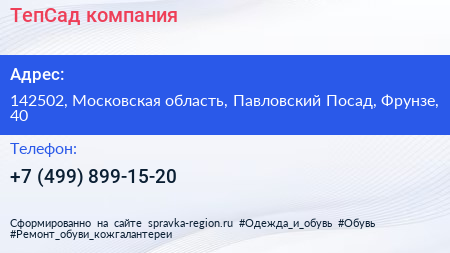 ТепСад, компания по адресу 142502, Московская область, Павловский Посад, Фрунзе, 40 в дальнейшем Организация, размещена в следующих категориях: