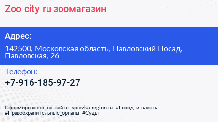 Zoo-city.ru, зоомагазин по адресу 142500, Московская область, Павловский Посад, Павловская, 26 в дальнейшем Организация, размещена в следующих категориях: