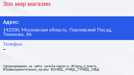 Зоо мир, магазин по адресу 142500, Московская область, Павловский Посад, Тихонова, 86 в дальнейшем Организация, размещена в следующих категориях: