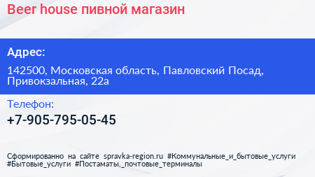 Beer house, пивной магазин по адресу 142500, Московская область, Павловский Посад, Привокзальная, 22а в дальнейшем Организация, размещена в следующих категориях: