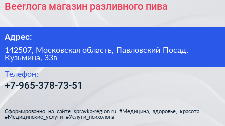 Beerлога, магазин разливного пива по адресу 142507, Московская область, Павловский Посад, Кузьмина, 33в в дальнейшем Организация, размещена в следующих категориях: