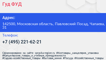 Гуд ФУД по адресу 142500, Московская область, Павловский Посад, Чапаева, 31 в дальнейшем Организация, размещена в следующих категориях: