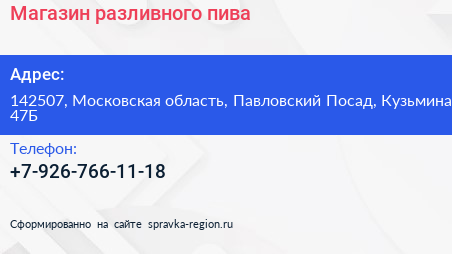 Магазин разливного пива по адресу 142507, Московская область, Павловский Посад, Кузьмина, 47Б в дальнейшем Организация, размещена в следующих категориях: