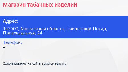 Магазин табачных изделий по адресу 142500, Московская область, Павловский Посад, Привокзальная, 24 в дальнейшем Организация, размещена в следующих категориях: