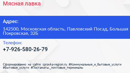 Мясная лавка по адресу 142500, Московская область, Павловский Посад, Большая Покровская, 32Б в дальнейшем Организация, размещена в следующих категориях: