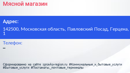 Мясной магазин по адресу 142500, Московская область, Павловский Посад, Герцена, 1 в дальнейшем Организация, размещена в следующих категориях: