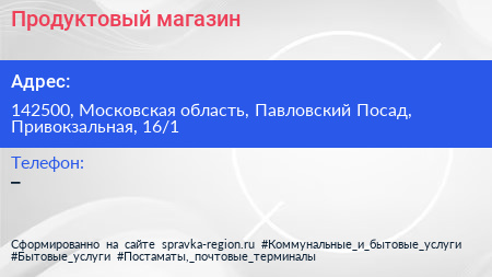Продуктовый магазин по адресу 142500, Московская область, Павловский Посад, Привокзальная, 16/1 в дальнейшем Организация, размещена в следующих категориях: