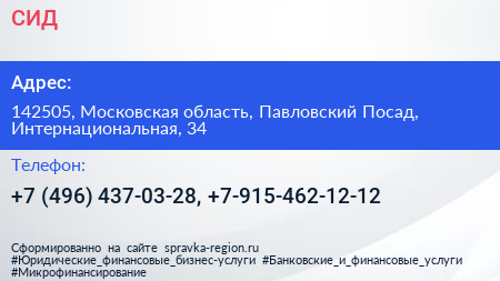 СИД по адресу 142505, Московская область, Павловский Посад, Интернациональная, 34 в дальнейшем Организация, размещена в следующих категориях: