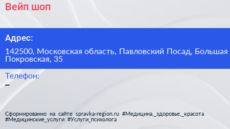 Вейп-шоп по адресу 142500, Московская область, Павловский Посад, Большая Покровская, 35 в дальнейшем Организация, размещена в следующих категориях: