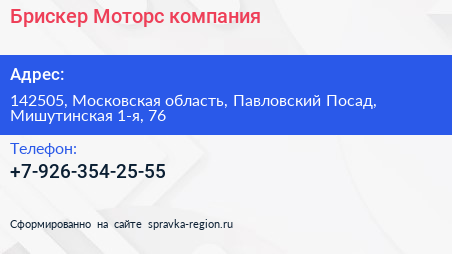 Брискер-Моторс, компания по адресу 142505, Московская область, Павловский Посад, Мишутинская 1-я, 76 в дальнейшем Организация, размещена в следующих категориях: