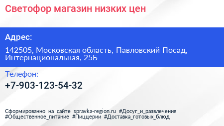 Светофор, магазин низких цен по адресу 142505, Московская область, Павловский Посад, Интернациональная, 25Б в дальнейшем Организация, размещена в следующих категориях: