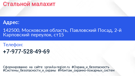 Стальной малахит по адресу 142500, Московская область, Павловский Посад, 2-й Карповский переулок, ст15 в дальнейшем Организация, размещена в следующих категориях: