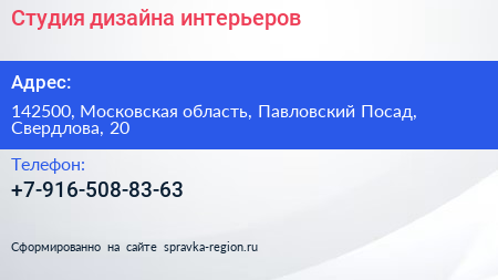 Студия дизайна интерьеров по адресу 142500, Московская область, Павловский Посад, Свердлова, 20 в дальнейшем Организация, размещена в следующих категориях: